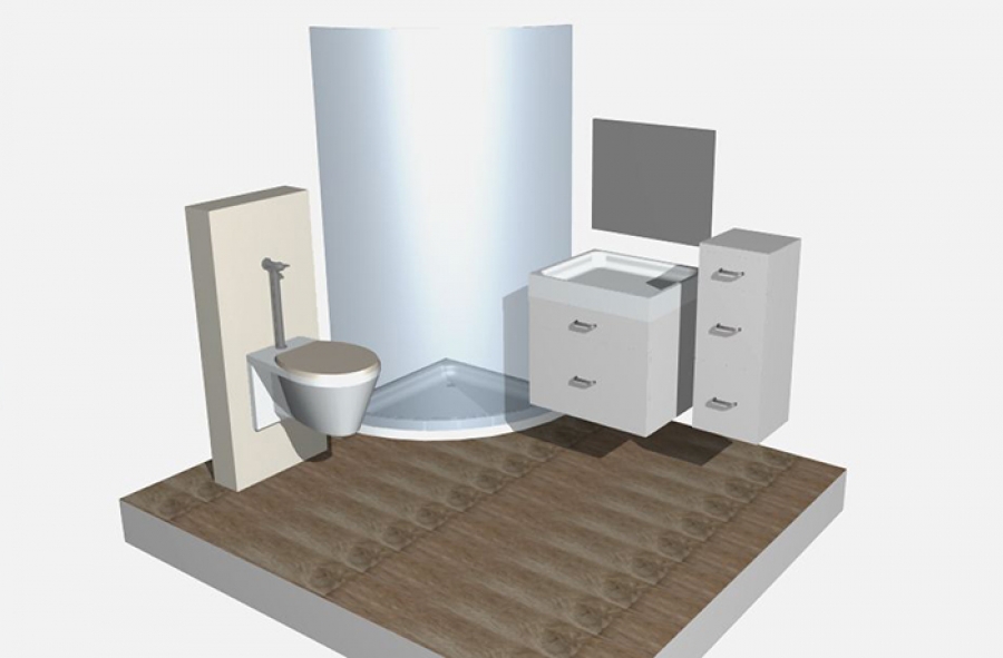 Επιπρόσθετα προτείνουμε μία δεύτερη λύση χωρίς πλυντήριο για να έχετε μία εικόνα της ευρυχωρίας που θα υπάρχει χωρίς αυτό. Η λεκάνη παραμένει στην ίδια θέση. Επιλέγεται γωνιακή ντουζιέρα με καμπίνα, νιπτήρας και στήλη αποθήκευσης κρεμαστά για ακόμη μεγαλύτερη αίσθηση ευρυχωρίας στο χώρο.