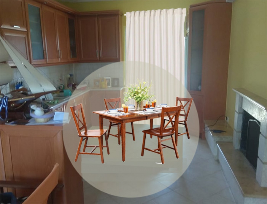 “Θα ήθελα τη συμβουλή σας για το τι χρώμα τραπεζαρία κουζίνας (τραπέζι+καρέκλες) να αγοράσω. Κουζίνα και καθιστικό είναι ενιαίος χώρος. Ο καναπές του σαλονιού είναι γωνιακός σε χρώμα γκρι. Οι τοίχοι σε γκρι λιλά πολύ απαλό. Στην κουζίνα τα ντουλάπια είναι ξύλινα σε ξύλο κερασιάς, τα πλακάκια εκρού κι ο τοίχος της κουζίνας κίτρινος. Υπάρχει κι ένα τζάκι σε χρώμα εκρού-μπεζ. Ταιριάζει τραπεζαρία σε χρώμα γκρι; Ξέρω ότι με το κίτρινο του τοίχου ταιριάζει το γκρι, αλλά με τα ντουλάπια; Μήπως θα έδενε καλύτερα με το χώρο τραπεζαρία σε ανάλογο χρώμα με τα ντουλάπια; Επισυνάπτω φωτογραφία. Ευχαριστώ για το χρόνο σας.” Όλγα