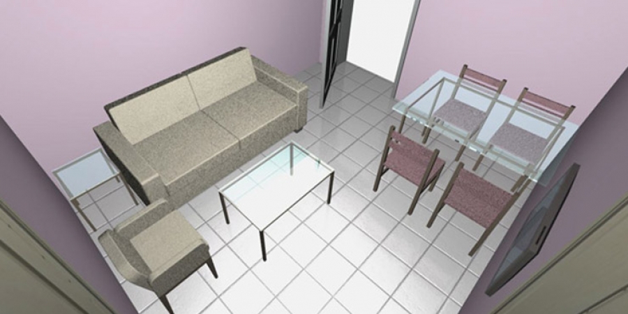 Δυστυχώς ο γωνιακός καναπές με τις διαστάσεις που αναφέρετε δεν μπορεί να τοποθετηθεί στο χώρο, οπότε προτείνουμε δύο διθέσιους καναπέδες τοποθετημένους αντικριστά με ένα μικρό τραπεζάκι μέσης.