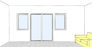 - Στην μπαλκονόπορτα: λεπτή κουρτίνα (οργαντίνα, βουάλ) με σούρα, σε δύο φύλλα που κινούνται με μηχανισμό αυλαίας.