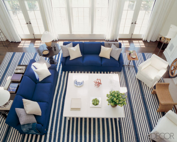 Αν αγαπάτε ιδιαίτερα τις αποχρώσεις του μπλε και ο καναπές δεν είναι σκουρόχρωμος αλλά γαλάζιος, τολμήστε να επαναλάβετε το ίδιο χρώμα και σε άλλα στοιχεία, όπως πολυθρόνες, τοίχους, χαλιά διακοσμητικά. Ωστόσο αποφύγετε την κυριαρχία του μπλε στις κουρτίνες: Κινδυνεύει να κάνει τον χώρο μουντό και πένθιμο.
