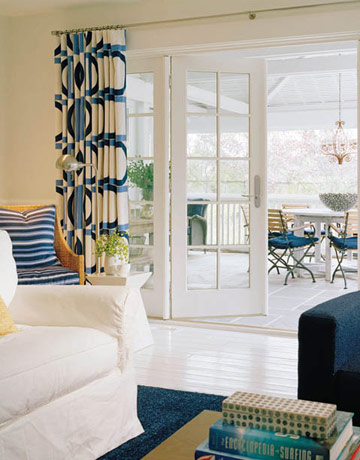 Ένας κλασικός συνδυασμός είναι μπλε με λευκό. Ταιριάζει σε σπίτια κάθε ύφους: Κλασικά, σύγχρονα, έθνικ. Η κουρτίνα μπορεί να είναι κατάλευκη, από γάζα ή από πιο στητό ύφασμα με σχέδιο στην ύφανση, ή να συνδυάζει λευκό και τόνους του μπλε σε ριγέ ή με άλλο σχέδιο.