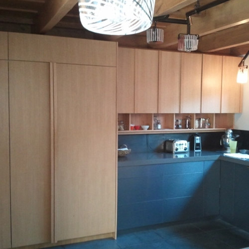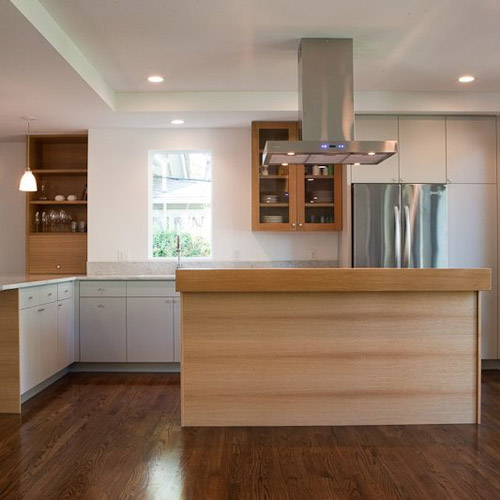 Ο σκούρος γρανίτης ενοποιεί οπτικά τον πάγκο της κουζίνας με τη νησίδα, αλλά προσδίδει μια αυστηρότητα στο χώρο. Το ξύλο, το ανοιχτόχρωμο πεύκο ή η σκούρα καρυδιά, με την αντίθεση στο χρώμα και την υφή που δημιουργεί με τον υπάρχοντα γρανίτη, δίνει ένα αίσθημα ζεστασιάς και οικειότητας στο χώρο, που ανταποκρίνεται στη χρήση του (κουζίνα).