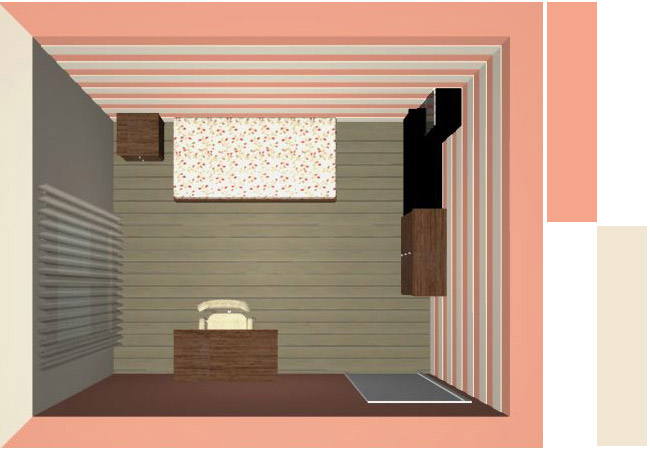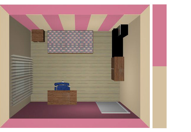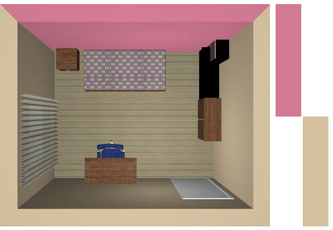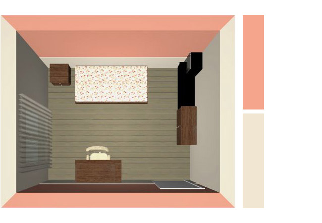 2. Κοραλί και χρώμα της άμμου, όπου οι τοίχοι του κρεβατιού και του γραφείου βάφεται με κοραλί από ύψος 1,00μ και πάνω. Οι άλλοι δύο και οι λωρίδες 1,00μ κάτω από το κοραλί βάφονται σε χρώμα της άμμου.