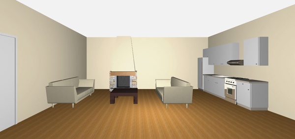Στη δεύτερη, που είναι συνθετότερη λύση προτείνουμε την επένδυση της φούσκας με τσιμεντοσανίδα, ώστε να ορθογωνιστεί και να επενδυθεί με την πορτοκαλί πέτρα μέχρι την οροφή. Με τον τρόπο αυτό το τζάκι αποκτά σύγχρονη μορφή, εντάσσεται και επιβάλλεται στο χώρο.