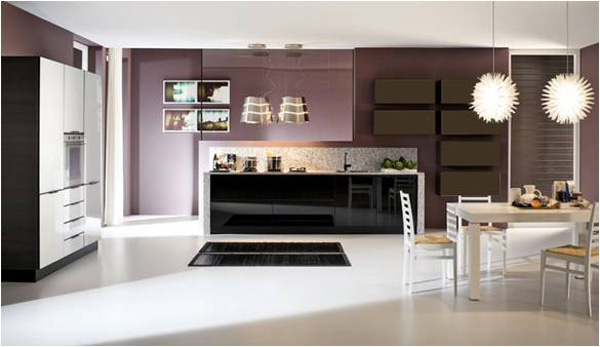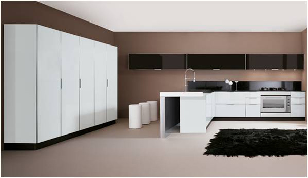 Ένα παράδειγμα είναι η παρακάτω κουζίνα η οποία συνδυάζει το μαύρο χρώμα στα κάτω ντουλάπια, μια απόχρωση της μόκας στα κρεμαστά ντουλάπια, με στήλες στο λευκό χρώμα και λευκό γρανίτη στο πάγκο.