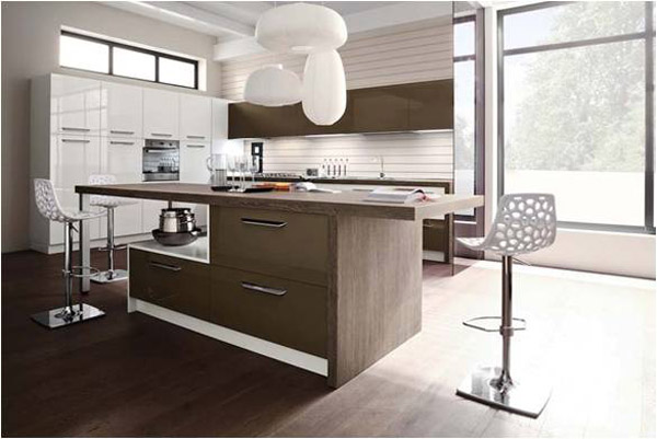 Στην παρακάτω κουζίνα όλα τα ντουλάπια είναι λάκα στην απόχρωση της μόκας με συνδυασμό τις λευκές στήλες και ξύλινο πάγκο. Δίνει ένα αρμονικό αποτέλεσμα.