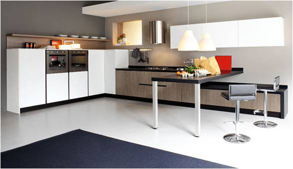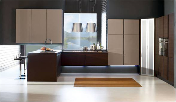 Στην παρακάτω κουζίνα έχουμε λευκή λάκα τα κρεμαστά ντουλάπια και τις ημιστήλες, μαύρο χρώμα στο πάγκο και έναν χρωματισμού ξύλου (μπεζ) στα κάτω ντουλάπια. Εδώ βλέπουμε ωραία αντίθεση στο πάγκο με τα κάτω και πάνω ντουλάπια.
