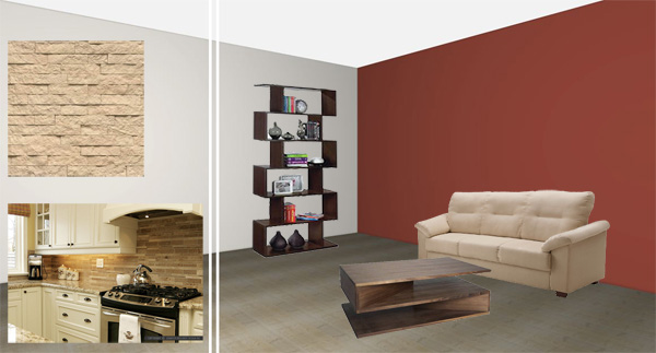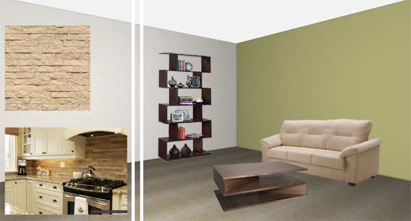 Τα χρώματα των στοιχείων του χώρου που περιγράφετε, δηλ. ο καναπές, τα έπιπλα και τα ντουλάπια κουζίνας, ακόμη και η πέτρα στον τοίχο εναρμονίζονται μεταξύ τους.