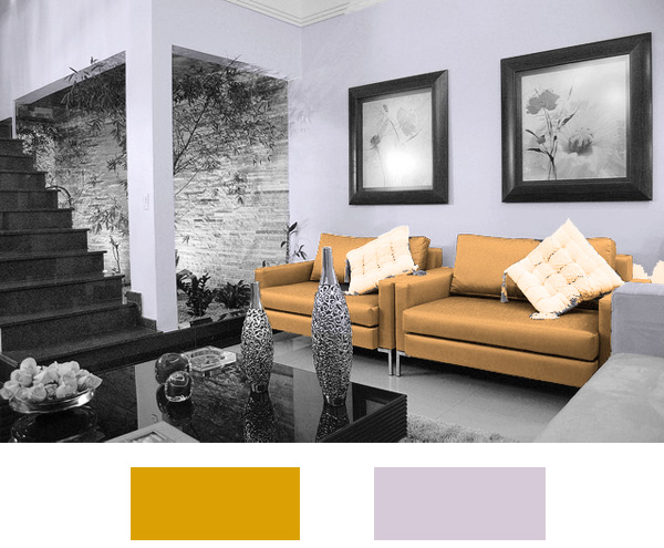 Ενδιαφέρουσα θα ήταν η δημιουργία, μια απαλής αντίθεσης μεταξύ των τοίχων (φόντο) και των καναπέδων. Το μουσταρδί είναι θερμό χρώμα και έτσι για φόντο θα μπορούσαμε να διαλέξουμε μια απαλή απόχρωση του βιολέ. Το βιολέ βρίσκεται στο τέλος των ψυχρών χρωμάτων και στην απαρχή των θερμών.