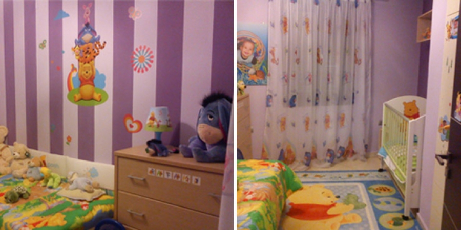 Η υφιστάμενη κατάσταση: Το παιδικό δωμάτιο είναι βαμμένο σε έντονες αποχρώσεις του μωβ. Οι συγκεκριμένες αποχρώσεις είναι περισσότερο θερμές (πλησιάζουν προς το ροζ) παρά ψυχρές. Το ύφος του δωματίου είναι φιλικό, ζεστό αλλά λίγο σκοτεινό και μελαγχολικό.