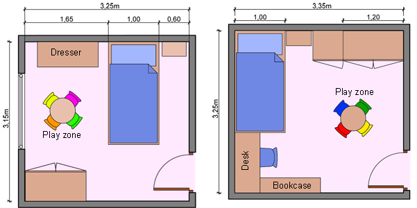 Παρακάτω παρουσιάζονται μερικές τυπικές κατόψεις παιδικών (ή εφηβικών) δωματίων για ένα χρήστη, δηλαδή με ένα κρεβάτι. Οι διαστάσεις των δωματίων είναι ενδεικτικές και θα πρέπει να γνωρίζετε ότι σημαντικό ρόλο στη διαρρύθμιση παίζει η θέση της πόρτας και των παραθύρων.