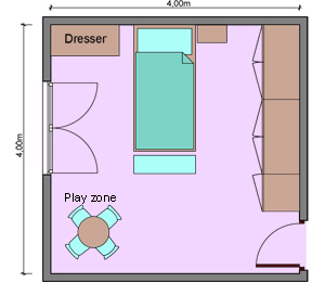 Η ζώνη παιχνιδιού μπορεί να οργανωθεί με την τοποθέτηση ενός μικρού τραπεζιού και καθισμάτων στο κέντρο του δωματίου. Στο χώρο αυτό, το παιδί μπορεί να ζωγραφίζει, να διαβάζει, να παίζει, ακόμη και να τρώει.