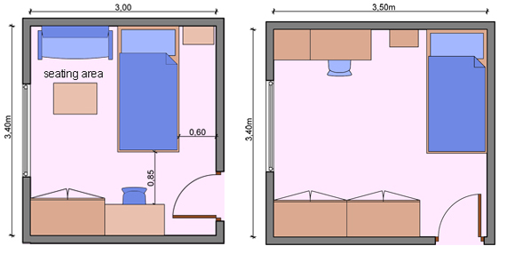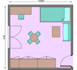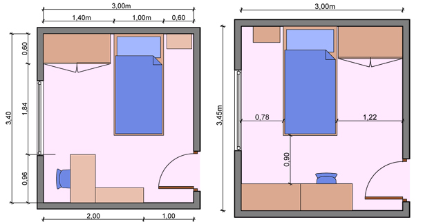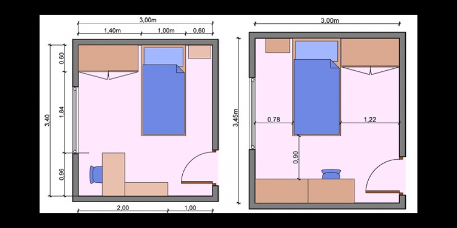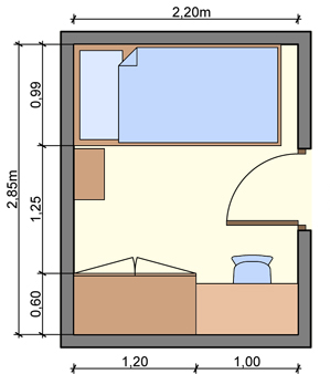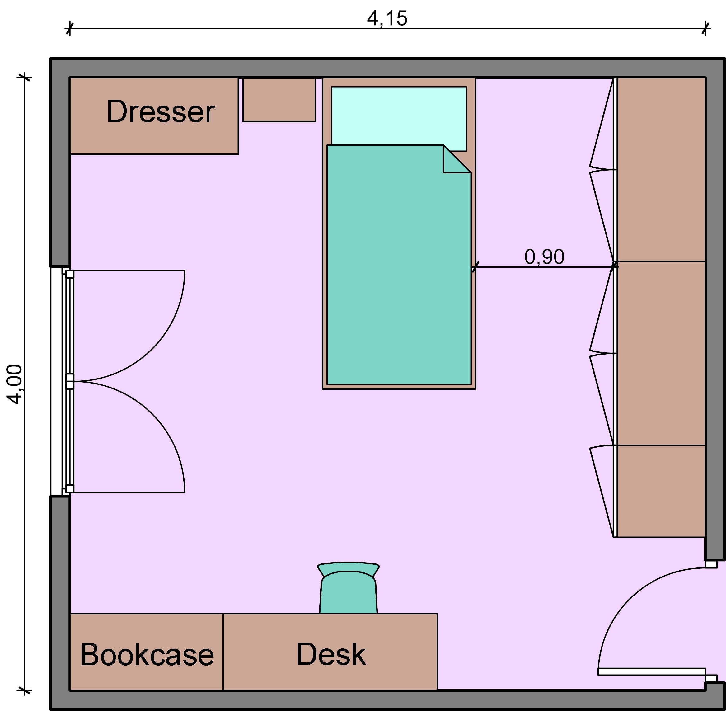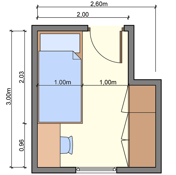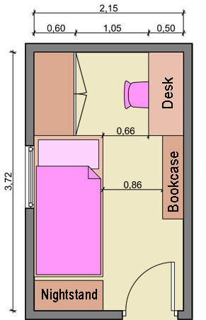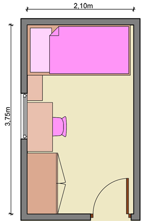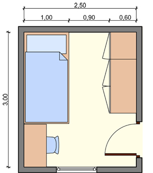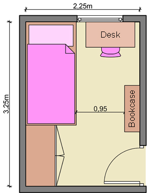 Δωμάτιο μικρών διαστάσεων με μονό κρεβάτι, κομοδίνο, γραφείο και ντουλάπα. Η συγκεκριμένη διαρρύθμιση είναι δυνατή επειδή η πόρτα εισόδου βρίσκεται στη μέση του τοίχου και αφήνει ελεύθερες τις δύο γωνίες. Ωστόσο, η περίπτωση να βρίσκεται η πόρτα στη μέση του δωματίου είναι σχετικά σπάνια.