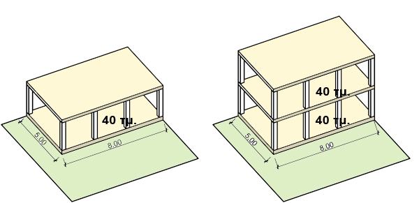 Παράδειγμα 1: Αν έχουμε ένα οικόπεδο 400 τμ. και ο συντελεστής δόμησης είναι 2.00 τότε όλο το κτίριο μπορεί να έχει εμβαδόν 400τμ. Χ 2.00 = 800 τμ.