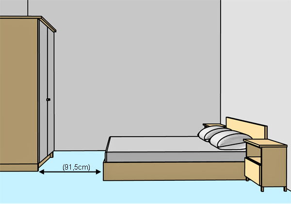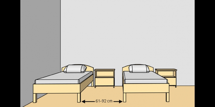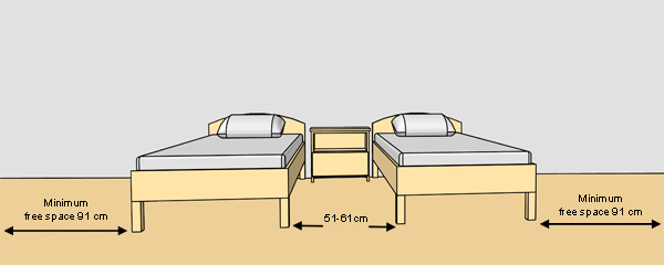 Η παρακάτω εικόνα παρουσιάζει την απόσταση που πρέπει να έχουν δύο κρεβάτια μεταξύ τους προκειμένου να είναι δυνατή η πρόσβαση και άνετη κίνηση. Φυσικά, όσο μεγαλύτερη είναι η απόσταση τόσο πιο άνετη είναι η κίνηση και χρήση του κρεβατιού, για παράδειγμα το στρώσιμο των σεντονιών.