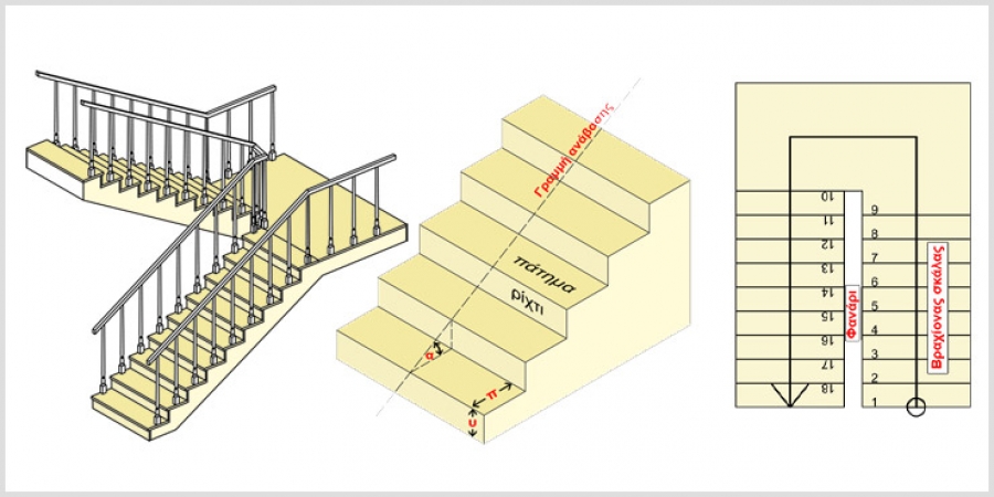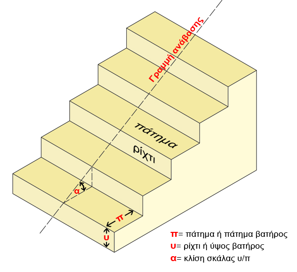 - Κλίση σκάλας: Είναι ο λόγος του ύψους προς το πλάτος του κάθε σκαλοπατιού, δηλαδή είναι η κλίση με την οποία είναι κατασκευασμένος ο κάθε βραχίονας. Ρίχτι/ Πάτημα= κλίση σκάλας.