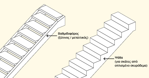 - Βαθμιδοφόρος: Είναι το κεκλιμένο στοιχείο πάνω στο οποίο στηρίζονται στα σκαλοπάτια.